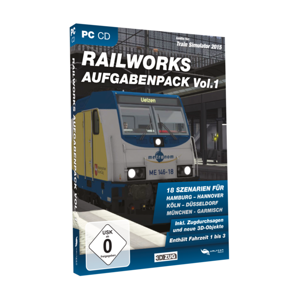 Die Box RW-Aufgabenpack Vol. 1 enthält die bisher nur als Downloadversion angebotenen Railworks Fahrzeiten Vol. 1 bis Vol. 3.
