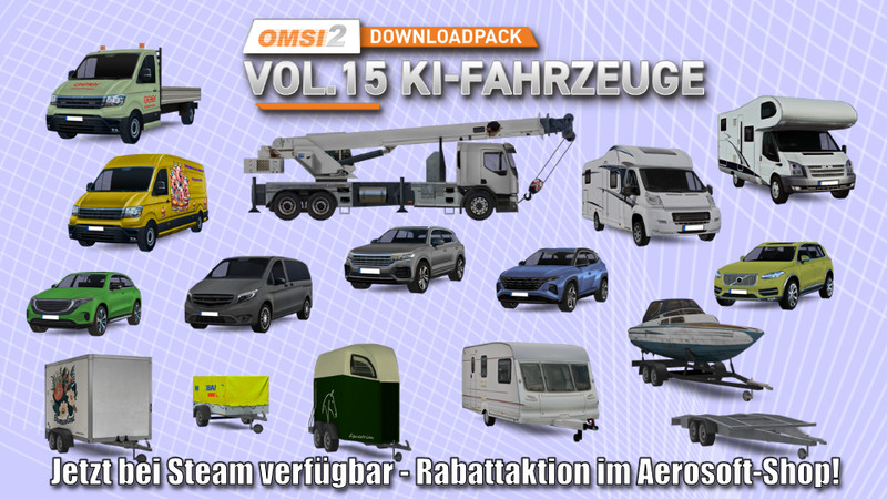 Frischer Wind für deine OMSI-Welt: Das neue Downloadpack Vol. 15 – KI-Fahrzeuge ist ab sofort bei Steam erhältlich und bringt eine echte Premiere mit sich, erstmals bereichern Fahrzeuge mit Anhängern den KI-Verkehr!