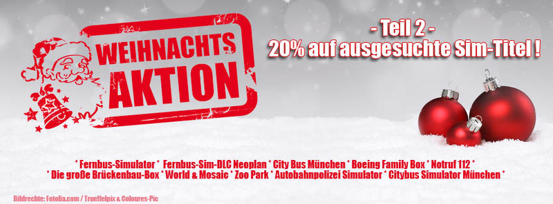 Die 2. Aktion geht vom 15. bis zum 21. Dezember 2017 und enthält ausgesuchte Titel aus dem Simulationsbereich. Mit dabei sind unter anderem der Fernbus-Simulator, das dazugehörige DLC, Notruf 112, die große Brückenbau-Box und Zoo Park, dieser ist sogar als Mac-Version erhältlich.